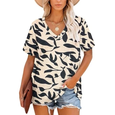 MOLERANI T Shirts for Women Tops Short Sleeve V Neck Summer Casual Loose Tee Apricot Black Leaf 3XL