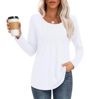 Superior Fabric Blend: This long sleeve t shirt for women is crafted from a premium blend of polyester and spandex, ensuring durability, comfort, and a slight stretch. The polyester provides excellent shape retention and resistance to wrinkles, while the spandex offers a flexible fit that moves with your body. This combination makes it one of the best womens long sleeve tops for everyday wear, perfect for those seeking both style and functionality Charming Pleated Detail: Stand out from the crowd with this unique long sleeve t shirts women featuring an eye-catching pleated design on the chest. The delicate pleats add a touch of elegance and femininity to the classic round neck, transforming this simple ladies t shirt into a stylish statement piece Easy to match:This oversized t shirt for women is a versatile staple in your wardrobe. As a womens longline t shirt, it pairs perfectly with leggings or skinny jeans for a casual, laid-back look. You can also tuck it into a high-waisted skirt or shorts to create a more polished outfit. Layer it under a denim jacket, blazer, or coat during colder months, or accessorize it with necklaces, scarves, and hats to express your personal style Occasion: This ladies long sleeve tops Suitable for daily, casual, business, work, dating, travel, holiday, party, outdoor activities, shopping Garment Care: To keep this womens long sleeve t shirts in top condition, simply machine wash it in cold water on a gentle cycle Or hand wash. Avoid using bleach to preserve the fabric's color and elasticity. Tumble dry on low heat or line dry to maintain its shape