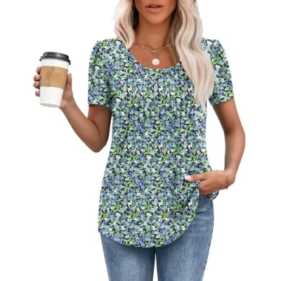 MOLERANI T Shirts for Women UK Round Neck Loose Casual Puff Short Sleeve Summer Tee Tops Front Pleated Shirt Blue Green Flowers 2XL