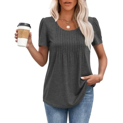 MOLERANI T Shirts for Women UK Round Neck Loose Casual Puff Short Sleeve Summer Tee Tops Front Pleated Shirt Grey 3XL