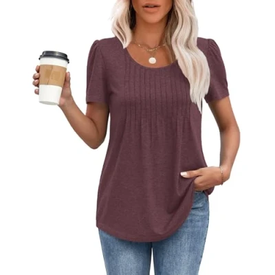 MOLERANI T Shirts for Women UK Round Neck Loose Casual Puff Short Sleeve Summer Tee Tops Front Pleated Shirt Wine Red S