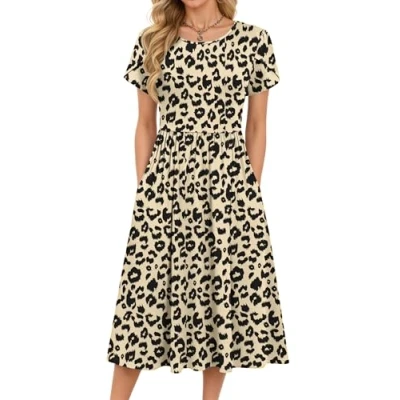 MOLERANI Women's Dresses Petal Short Sleeve Round Neck Casual Ladies Swing Midi Dress Holiday Beach with Pockets Leopard M