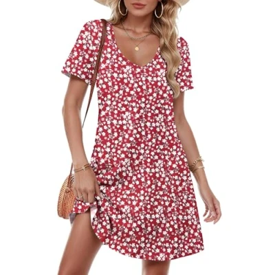 MOLERANI Women's Summer Dress Short Sleeve V Neck Sundress Casual with Pockets Flower Red M