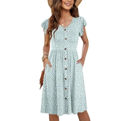 Material:This summer dresses for women is 90% polyester 10% spandex.The fabric is lightweight, Stretchy and Soft. It's Comfy Against the Skin Simple Design: The summer dress is ruffled sleeves, v-neckline, button embellishment, extreme knee length, plus functional pockets, elasticated waistband creates natural pleats for a slimmer look Easy Match:This women dress goes well with sandals,high heels or ankle boots,hat,or wear with a Pretty Necklace for a Fashion Look,Which Makes You Looks More Stylish and Elegant.Wearing a jacket or cardigan over it is fashionable during fall Occasions:This ruffle sleeve dress suit for Daily wear,Beach,Party,Wedding,Vacation,Home,Office,School,Shopping,Travel. Suitable for spring, summer and autumn Size:There are standard size Small/Medium/Large/X-Large/2X-Large for this summer dress to choose from.Please check it before you order