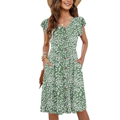 Material:This summer dresses for women is 90% polyester 10% spandex.The fabric is lightweight, Stretchy and Soft. It's Comfy Against the Skin Simple Design: The summer dress is ruffled sleeves, v-neckline, button embellishment, extreme knee length, plus functional pockets, elasticated waistband creates natural pleats for a slimmer look Easy Match:This women dress goes well with sandals,high heels or ankle boots,hat,or wear with a Pretty Necklace for a Fashion Look,Which Makes You Looks More Stylish and Elegant.Wearing a jacket or cardigan over it is fashionable during fall Occasions:This ruffle sleeve dress suit for Daily wear,Beach,Party,Wedding,Vacation,Home,Office,School,Shopping,Travel. Suitable for spring, summer and autumn Size:There are standard size Small/Medium/Large/X-Large/2X-Large for this summer dress to choose from.Please check it before you order