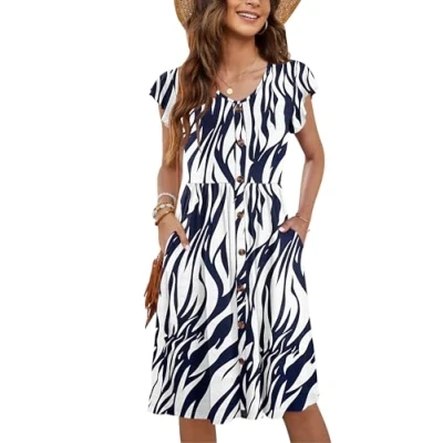 Material:This summer dresses for women is 90% polyester 10% spandex.The fabric is lightweight, Stretchy and Soft. It's Comfy Against the Skin Simple Design: The summer dress is ruffled sleeves, v-neckline, button embellishment, extreme knee length, plus functional pockets, elasticated waistband creates natural pleats for a slimmer look Easy Match:This women dress goes well with sandals,high heels or ankle boots,hat,or wear with a Pretty Necklace for a Fashion Look,Which Makes You Looks More Stylish and Elegant.Wearing a jacket or cardigan over it is fashionable during fall Occasions:This ruffle sleeve dress suit for Daily wear,Beach,Party,Wedding,Vacation,Home,Office,School,Shopping,Travel. Suitable for spring, summer and autumn Size:There are standard size Small/Medium/Large/X-Large/2X-Large for this summer dress to choose from.Please check it before you order