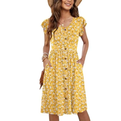 Material:This summer dresses for women is 90% polyester 10% spandex.The fabric is lightweight, Stretchy and Soft. It's Comfy Against the Skin Simple Design: The summer dress is ruffled sleeves, v-neckline, button embellishment, extreme knee length, plus functional pockets, elasticated waistband creates natural pleats for a slimmer look Easy Match:This women dress goes well with sandals,high heels or ankle boots,hat,or wear with a Pretty Necklace for a Fashion Look,Which Makes You Looks More Stylish and Elegant.Wearing a jacket or cardigan over it is fashionable during fall Occasions:This ruffle sleeve dress suit for Daily wear,Beach,Party,Wedding,Vacation,Home,Office,School,Shopping,Travel. Suitable for spring, summer and autumn Size:There are standard size Small/Medium/Large/X-Large/2X-Large for this summer dress to choose from.Please check it before you order