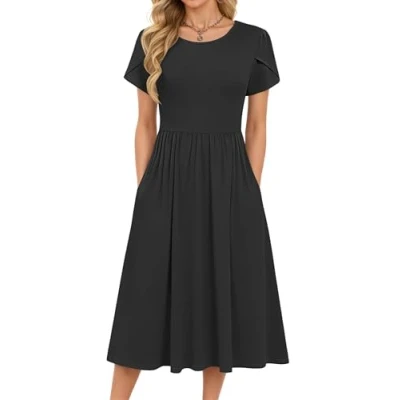 MOLERANI Women Summer Dresses Short Sleeve Round Neck A line Sundress Plain Dress Casual Swing Elastic Waist Midi with Pockets Black L