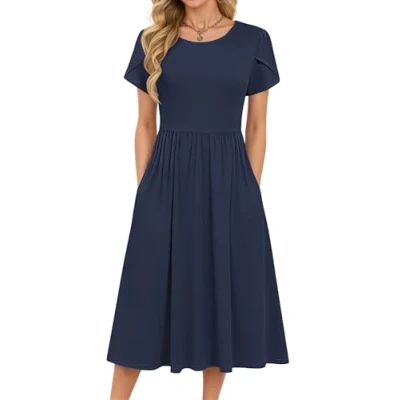 MOLERANI Women Summer Dresses Short Sleeve Round Neck A line Sundress Plain Dress Casual Swing Elastic Waist Midi with Pockets Navy Blue L