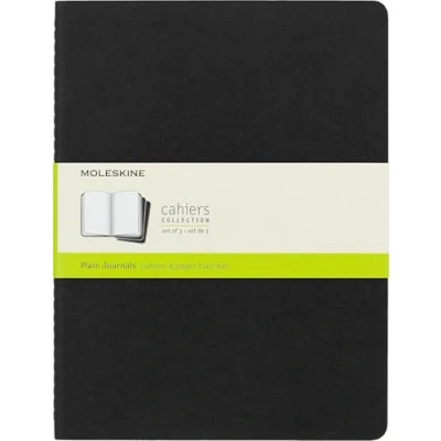 MOLESKINE CAHIER: This 7.5 x 9.5 plain journal has a flexible heavy-duty customizable cardboard cover, a pocket for loose notes & visible stitching on the spine. The last 16 sheets are detachable. CLASSIC DESIGN: The Cahier Journal is a favorite among avid notetakers. Its cardboard cover makes it ideal for customization—script a favorite quote, sketch a portrait or simply give it a name. CLASSIC DESIGN: The Cahier Journal is a favorite among avid notetakers. Its cardboard cover makes it ideal for customization—script a favorite quote, sketch a portrait or simply give it a name. ICONIC NOTEBOOKS FOR EVERY PURPOSE: The story of the iconic Moleskine notebook collection has expanded to include a whole variety of sizes and colors, textures and layouts, and even flexible covers.