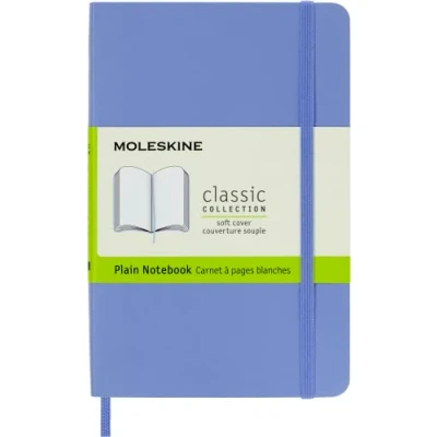 The classic and legendary Moleskine notebook is tinged once again with new colours and shading maintaining the iconicity and characteristics of the most loved notebook Classic design with elastic closure and a convenient bookmark to never lose your place. On the back, an expandable pocket to hold important notes and papers The notebook has 192 pages with plain layout and ivory-coloured 70 g/m² acid-free paper and the iconic "In case of loss" notice for your contact information in case you lose your notebook On the B-SIDE of the reusable band, additional instruments are printed. The Moleskine story is printed inside all our products. Opens totally at 180° The package contains a notebook with plain layout and soft cover, available in size Pocket 9 x 14 cm, 192 pages, hydrangea blue