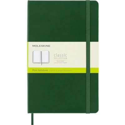 The classic and legendary Moleskine notebook is tinged once again with new colours and shading maintaining the iconicity and characteristics of the most loved notebook Classic design with elastic closure and a convenient bookmark to never lose your place. On the back, an expandable pocket to hold important notes and papers The notebook has 240 pages with plain layout and ivory-coloured 70 g/m² acid-free paper and the iconic "In case of loss" notice for your contact information in case you lose your notebook On the B-SIDE of the reusable band, additional instruments are printed. The Moleskine story is printed inside all our products. Opens totally at 180° The package contains a notebook with plain layout and hard cover, available in size large 13 x 21 cm, 240 pages, myrtle green