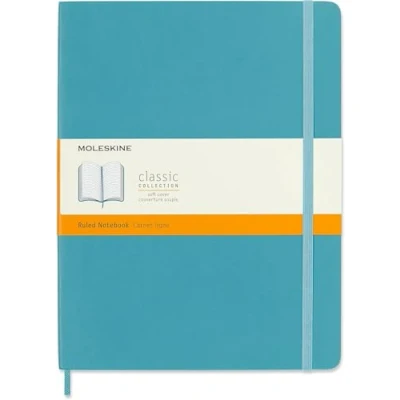 The classic and legendary Moleskine notebook is tinged once again with new colours and shading maintaining the iconicity and characteristics of the most loved notebook Classic design with elastic closure and a convenient bookmark to never lose your place. On the back, an expandable pocket to hold important notes and papers The notebook has 192 pages with ruled layout and ivory-coloured 70 g/m² acid-free paper and the iconic "In case of loss" notice for your contact information in case you lose your notebook On the B-SIDE of the reusable band, additional instruments are printed. The Moleskine story is printed inside all our products. Opens totally at 180° The package contains a notebook with ruled layout and soft cover, available in size extra large 19 x 25 cm, 192 pages, reef blue
