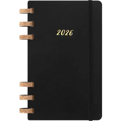 12 MONTHS: Start the year with these spiral planners, which cover the entire year from January to December 2026 MONTHLY AND WEEKLY: Each month begins with a monthly calendar to plan long-term events, while each week is divided into two pages to provide the right space for your ideas. ICONIC DESIGN: The exclusive spiral in a mix of durable and flexible cork adds a touch of warmth and originality. FEATURES: In addition to organizational tools, you will find a section dedicated to prioritization, a habit and mood tracker, and a space for reflection at the end of each month. PACKAGE: Includes a spiral-bound planner, available in black and beige, stickers, and 3 bookmarks to personalize your schedule.