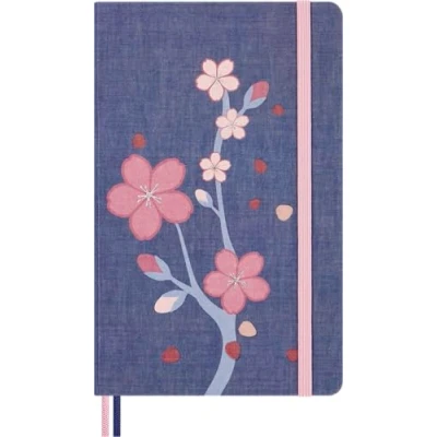 Moleskine Sakura Notebook, Notebook with Blank Pages, Hardcover in Fabric and Elastic Closure, Greeting Card Themed Stickers, Large Size 13 x 21 cm