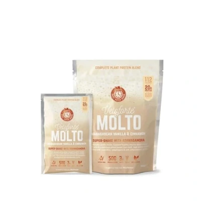 Find your inner peace with Molto - nourishing complete protein, balancing ashwagandha and gut healthy prebiotics. One velvety smooth, delicious vanilla shake crafted for mind and body? No stress. This vanilla shake is anything but ordinary. Packed with 500mg of the Indian super-shrub ashwagandha, a Molto each day can help you stay on top of life's stresses by reducing cortisol levels (a hormone produced in response to stress) and inflammation by up to 30% whilst improving your mood and sleep too. Get the building blocks right with 20g of complete plant protein, 3g of BCAAs and all nine essential amino acids - each serve of Molto promotes healthy muscle recovery, improved energy levels and supports hormone and enzyme production too. Take the stress out of getting your protein right, feed your good gut bacteria with prebiotic chicory fibre and let the soothing cinnamon restore your wellness and performance from the inside out. Delicious on its own, to power up pancakes, shake up smoothies or invigorate your overnight oats. Molto is the ultimate vanilla shake!