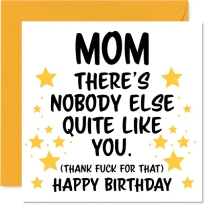 MAKE YOUR MOM SMILE WITH THIS UNIQUE BIRTHDAY CARD: This exceptional quality Mom birthday card shows the design 'Mom Theres nobody else quite like you. (Thank fuck for that) Happy Birthday'. If you are looking for an awesome birthday card for Mom, then then this happy birthday Mom card is bound to make them smile. Not just a birthday card for Mom this could also be a birthday gifts for Mom, Mommy or Mother. WHAT DO YOU GET: The card is printed on one side and BLANK ON THE INSIDE to allow you to write your very own message. The unique fun design is printed on a specially sourced and environmentally responsible board. At 360 microns thick the natural white one-sided gloss board has a quality look and feel. Supplied with a coloured gummed envelope to complement the design and ready to be sealed and sent in the post. Great Mom birthday cards, Mommy birthday card. NO INK SMUDGES: There is nothing worse than writing inside a card to find that the shiny surface makes the ink smudge. This is why we use a high quality one sided coated board. The uncoated side will absorb more of the ink from your pen to make smudging a thing of the past. Mom birthday cards, Mom birthday cards from Son. SIZES: Greeting Card = 145mm x 145mm, Envelope = 155mm x 155mm, Card Thickness = 360 micron. Happy birthday Mom, Moms birthday card, Mom cards birthday, birthday card Mom, happy birthday Mom card, Mom gifts from Son. MADE AND QUALITY CHECKED IN THE UK: We print and manufacture all our products right here in the UK so you can be sure of a fast turnaround and a product that is expertly made. Using environmentally responsible premium board our card is conscious of the responsible management of the world's forests - happy birthday card Mom, Mom birthday cards.