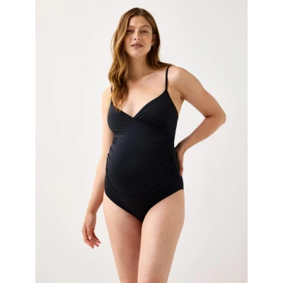Maternity swimsuit with v-neck and wrap design as well as gathered detailing at the sides.