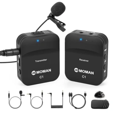 Moman Wireless Lavalier Microphone C1, 2.4GHz Compact Lapel Mic System with Noise Cancellation 656FT Transmission 8H Battery Life for DSLR Cameras/Smartphone/Tablet/Live Streaming