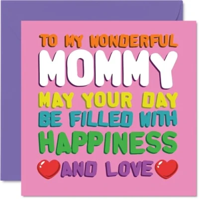 MAKE YOUR MOMMY SMILE WITH THIS UNIQUE BIRTHDAY CARD: This exceptional quality Mommy birthday card for her shows the design 'To my wonderful Mommy may your day be filled with happiness and love'. If you are looking for a beautiful birthday card Mommy for her, then then this happy birthday Mommy card is bound to make her smile. Not just a birthday card for Mommy this could also be a birthday gifts for Mommy, Mom or Mother. WHAT DO YOU GET: The cards are printed on both sides with the inside print saying 'Have a Great Day' and ample space for your own personal message. The unique fun design is printed on a specially sourced and environmentally responsible board. At 360 microns thick the natural white one-sided gloss board has a quality look and feel. Supplied with a coloured gummed envelope to complement the design and ready to be sealed and sent in the post. NO INK SMUDGES: There is nothing worse than writing inside a card to find that the shiny surface makes the ink smudge. This is why we use a high quality one sided coated board. The uncoated side will absorb more of the ink from your pen to make smudging a thing of the past. Mommy birthday cards, Mommy birthday cards from Son. SIZES: Greeting Card = 145mm x 145mm, Envelope = 155mm x 155mm, Card Thickness = 360 micron. Happy birthday Mommy, Mommys birthday card, Mommy cards birthday, birthday card Mommy, happy birthday Mommy card, Mommy gifts from Son. MADE AND QUALITY CHECKED IN THE UK: We print and manufacture all our products right here in the UK so you can be sure of a fast turnaround and a product that is expertly made. Using environmentally responsible premium board our card is conscious of the responsible management of the world's forests - happy birthday card Mommy, Mommy birthday cards.