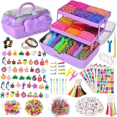 17,000+ Loom Bands in 32 Vibrant Colors:This kit includes over 17,000 loom bands in a wide range of 32 vibrant colors, giving kids everything they need to explore their creativity and make endless patterns. The high elasticity and durability of the bands ensure a smooth and enjoyable crafting experience Packed with 30+ Accessories for Complete Bracelet Making Fun: This all-in-one kit comes with everything needed for endless creativity: 600 S-clips (300 colored + 300 transparent), 300 pony beads, 150 alphabet beads (A–Z), 52 rubber charms, 5 lobster clasps, 5 tassels, 8 hair clips, 6 stickers, 6 small crochet hooks, 1 large crochet hook, 5 small loom boards, 2 Y-shaped looms, and a bell. Designed to offer kids a full DIY experience with multiple styles, textures, and decorative options. Unleash Endless Creativity: With 17,000 vibrant loom bands, this all-in-one kit empowers kids to design unique bracelets, rings, necklaces, headbands, charms, and more. A perfect way to spark imagination and keep little hands happily creating for hours. Upgraded 3-Layer Storage Box: Neat, Sturdy & Portable, comes with a newly designed 3-layer storage box that keeps all accessories sorted, secure, and easily accessible. Perfect for staying organized at home or taking creativity on the go.. Perfect Gift for Any Occasion: Whether it’s Christmas, birthdays, Easter, New Year, or just because, this vibrant loom band kit makes a thoughtful and fun DIY gift for both boys and girls. A sure way to bring joy and creativity to any celebration.