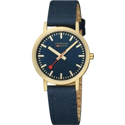 Mondaine Women's stainless steel watch with deep ocean blue dial The watch has a gold stainless steel case with a diameter of 36 mm Environmentally friendly recycled PET bracelet with cork lining: the comfortable bracelet is made of 50% RPET, 25% recycled PU and 25% cork Mineral glass: the robust mineral glass protects the dial from scratches and bumps Swiss made watch with quartz movement: enjoy precise time keeping and 30 metres water resistance
