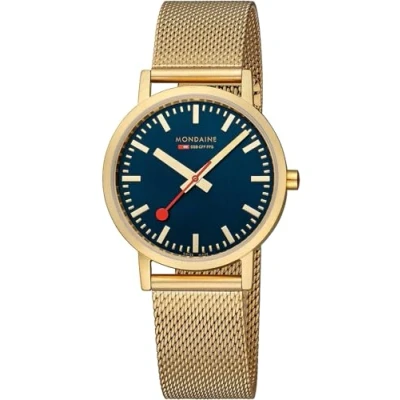 Mondaine Women's stainless steel watch with deep ocean blue dial The watch has a gold stainless steel case with a diameter of 36 mm Practical quick release system: Milanese stainless steel strap with a practical strap change system for quick and easy replacement Mineral glass: the robust mineral glass protects the dial from scratches and bumps Swiss made watch with quartz movement: enjoy precise time keeping and 30 metres water resistance