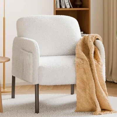 [Soft and Skin-Friendly Fabric] - This armchair features high-quality lambswool fabric in gentle colors, with a fluffy texture that feels soft and comfortable to the touch. [Ultimate Back Support] - The backrest and seat cushion of this sofa chair are filled with high-density foam, the slightly tilt back invites you to sink in for a laid-back feel. Equipped with a zipper, the backrest is removable and washable. [Smart Side Pockets] - Two fleece-lined pockets swallow remotes/books/snacks. Never pause your detective drama to hunt for lost biscuits or TV controls. [Comfortable Sitting Experience] - High-density foam mimics premium ergonomic contours. 48cm seat depth cradles petite to tall frames and spring base handles 120kg [Durable Metal Frame] - This armchair is supported by a metal frame, featuring black (or gold) metal legs that ensure lightweight portability while offering stability. Non-slip feet grip everything from shag carpets to parquet. [Suitable for Various Rooms] - Ideal for smaller spaces, its compact size and simple 4-step assembly process make it a great seating choice for apartments, living rooms, bedrooms, or offices.