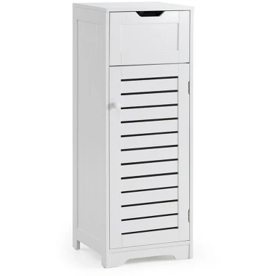 Amazon[Large Storage Space] This product features 1 drawer and 1 door, allowing you to better classify your items. You can store different items according to your needs. [Unique Design] The white appearance and the design of louver door add a modern style to the bathroom cabinet. The louvered door also provides better ventilation, effectively preventing items inside the cabinet from getting moldy. [Versatile Usage] This floor cabinet has compact size that can be used as a bathroom cabinet in the bathroom, or placed in the bedroom, living room, hallway, kitchen, truly achieving multi-purpose use. [Stable and Durable] Made of MDF, this bathroom cabinet has good stability and a long service life. Additionally, the floor cabinet comes with an anti-tipping device to enhance safety during use. [Easy Assembly] It includes clear labeled components and illustrated instructions, allowing you to easily assemble this standalone bathroom cabinet.