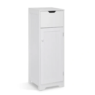 [ STORAGE CABINET FOR SMALL SPACE ] - This modern white bathroom cabinet is suitable for small space storage and contains a drawer and a cabinet with two shelves to make full use of limited space. The slim design allows it to be placed in a smaller space, saving more space for the house. [ MOISTURE PROOF AND EASY TO CLEAN ] - The bathroom cabinet is made of E1 grade MDF, and the surface is treated with environmental protection white paint, which is waterproof and easy to clean. The cabinet does not contain open space, which can better protect the objects stored inside. Moreover, it's perfect for storing bath products and you can decorate the surface with potted plants or scented candles. [ FLEXIBLE ADAPTATION TO VARIOUS ROOMS ] - After the white paint treatment of the surface, the perfect combination of layered lines and wooden handle, give the cabinet elegant texture, so that the cabinet can almost match with any color and decorative style. Moreover, it can be used as bathroom cabinet, corner table, porch cabinet. [ EXQUISITE DESIGN DETAILS ] - The drawers of this cabinet are designed with slotting to avoid the trouble of installing slide rails. The cabinet door can be opened at 180 ° for easy handling and placing. By adding high feet to avoid erosion of internal objects by running water. The use of double-layer shelves, which it is convenient to place more items. [ EASY TO INSTALL ] - The cabinet size is H87cm x W30cm x D33cm. Fixtures and detailed installation instructions are attached to the package. Besides, the boards are numbered in accordance with the instructions. If you have any questions about the cabinet, please feel free to contact our team. Included components: includes 2 leaves Mounting type: floor mount