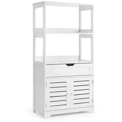 Ample Storage Space This tall cabinet features 2 open shelves for your daily essentials, plus a spacious drawer and a lower cupboard to neatly store toilet rolls, cleaning supplies, and more, keeping your bathroom tidy. Stylish & Ventilated Design The crisp white finish and chic louvre door panels give this unit a modern look. The louvre design also promotes better air circulation, helping to prevent moisture and mildew build-up inside. Easy to Assemble All parts are clearly labelled and come with straightforward, step-by-step instructions. You can easily set up this freestanding cabinet yourself, ready to use in no time. Sturdy & Stable Build Constructed from robust, water-resistant MDF, this cabinet is durable and easy to wipe clean. It includes an anti-tip kit for added safety and stability in your home. Versatile for Any Room Perfect as a bathroom floor cabinet, it's also ideal for the kitchen, bedroom, hallway, or office. It's a great storage solution for organising items in any