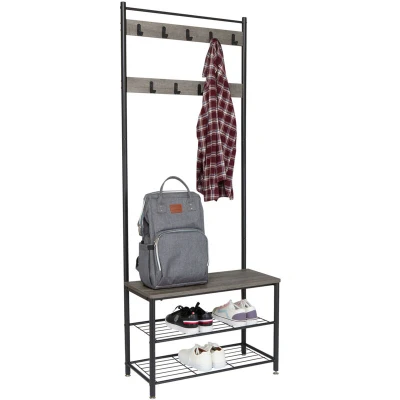 Mondeer Coat Rack Stand, Shoe Rack, Clothes Storage Bench with 9 Hooks, Metal Hall Tree, Frame for Bedroom, Living, Room Hallway, Grey