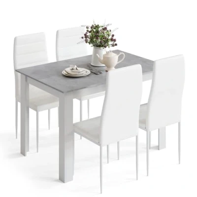 ManoManoModern & Elegant Style This dining set blends functionality with contemporary aesthetics. The table in Grey & White, paired with four sleek white chairs, creates a visually harmonious look that brings brightness and sophistication to your dining room, kitchen, or lounge. Solid & Durable Build Built to last for years of daily use. The table is crafted from solid pine wood for excellent stability and strength. The chairs feature a sturdy metal frame and water-resistant faux leather seats that are easy to clean and maintain. Authentic Comfort Enjoy relaxed meals with exceptional comfort. The chairs boast an ergonomic high backrest and generously padded seat, providing optimal support and wellbeing during every family dinner or gathering with friends. Versatile for Any Space Thanks to its timeless design and neutral colours, this set adapts perfectly to your dining room, kitchen, breakfast nook, or even a conservatory. Ideal for creating a dedicated eating area in any home. Simple & Quick