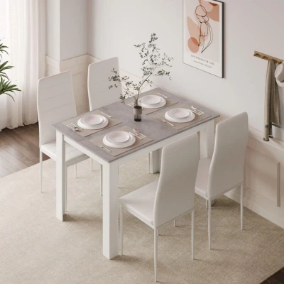 Modern & Elegant Style This dining set blends functionality with contemporary aesthetics. The table in Grey & White, paired with four sleek white chairs, creates a visually harmonious look that brings brightness and sophistication to your dining room, kitchen, or lounge. Solid & Durable Build Built to last for years of daily use. The table is crafted from solid pine wood for excellent stability and strength. The chairs feature a sturdy metal frame and water-resistant faux leather seats that are easy to clean and maintain. Authentic Comfort Enjoy relaxed meals with exceptional comfort. The chairs boast an ergonomic high backrest and generously padded seat, providing optimal support and wellbeing during every family dinner or gathering with friends. Versatile for Any Space Thanks to its timeless design and neutral colours, this set adapts perfectly to your dining room, kitchen, breakfast nook, or even a conservatory. Ideal for creating a dedicated eating area in any home. Simple & Quick