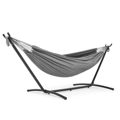 Sturdy & Long-Lasting: Plastic-sprayed galvanized tube frame prevents rust and scratches, ensuring durable support for the hammock with a 200 kg load capacity. Ties and non-slip feet enhance durability and stability. Breathable Comfort: The hammock features a thicker, tighter, and more natural polyester material weaving process for a breathable bed surface. Perfect for lazy days by the lake, on the patio, or under your favorite tree in the yard. Adjustable Height: Customize your comfort with hooks and holes on the stand for easy height adjustment, allowing you to find your ideal hammock position. Portable Convenience: Easily disassemble into 5 pieces for quick storage in the included bag. Take it from the patio to the beach, park, or campsite with ease. Simple Assembly: The screwless design ensures easy installation. Tighten by hand for a quick setup in just a few minutes. All hardware and clear assembly instructions are included in the package.