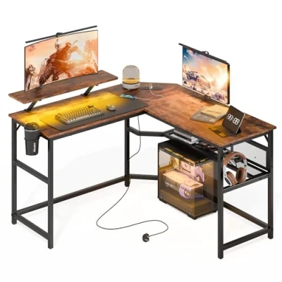 Mondeer L Shaped Gaming Desk, Computer Desk with LED Lights 2 Power Outlets and USB Ports, Reversible Corner Storage Shelf, for Home Office Bedroom, 130 x cm, Rustic Brown