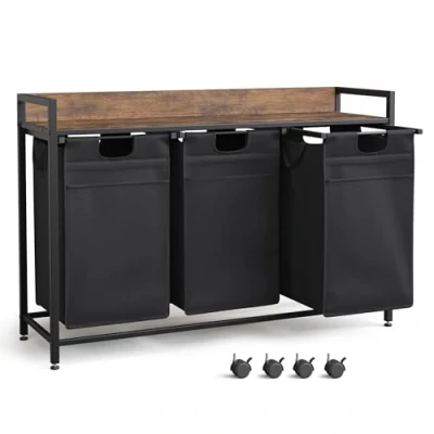 Mondeer Laundry Basket with Wheels, Hamper 3 Compartments, Metal Frame Washing Storage Shelf and Front Bag for Bedroom Bathroom, 3x50L, 106 * 33 75 cm