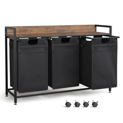 Mondeer Laundry Basket with Wheels, Hamper 3 Compartments, Metal Frame Washing Storage Shelf and Front Bag for Bedroom Bathroom, 3x50L, 106 * 33 75 cm