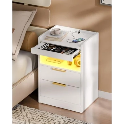 [A Discreet, Hidden Drawer] Discover a cleverly hidden drawer(Gap ≤2mm) with soft black felt lining integrated for your valuables. It’s the right discreet spot for your watches and jewellery safe, scratch-free, and out of sight. [Smart Multi-Level Storage] Features 2 different size drawers plus a large open compartment. Neatly organise everything from remotes and books to smaller items, and effortlessly banish bedside mess. [Multi-Colour Mood Lighting] With a simple touch, switch the built-in LED light from a bright white for reading to a warm yellow for sleep, or even to a romantic purple or calming blue to instantly set the perfect mood. [Charging Station on the Top Surface] The 2 USB ports and 2 sockets are conveniently built right into the top. Just place your devices down to charge—no fumbling with cables or searching for plugs, keeping your bedside tidy and functional. [Secure, Recessed Top Surface] The slightly sunken top with raised edges on all four sides helps keep your phone and glasses safely in place, even if you bump into the table at night. [Versatile for Any Room] More than just a bedside table, it's a perfect side table for your living room or a handy storage unit for your study, offering convenient charging and mood lighting wherever you need it.