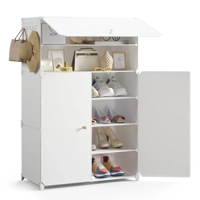 Mondeer Shoe Storage Cabinet, 6 Tier for 18 Pairs of Shoes, Oversized Plastic Rack with Doors, Removable Shelf and Hooks, Hallway Entryway Closet, White