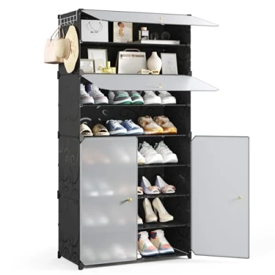 Mondeer Shoe Storage Cabinet, 8 Tier for 24 Pairs of Shoes, Oversized Plastic Rack with Doors, Removable Shelf and Hooks, Hallway Entryway Closet, Black