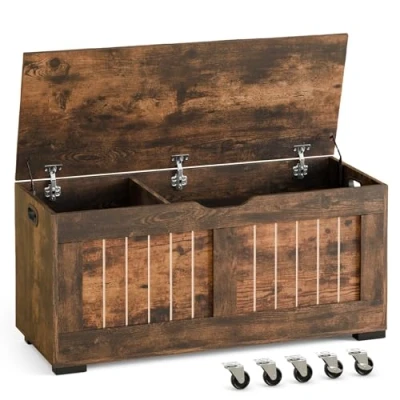 [Magic Storage Space] This wide vintage chest (over 100 cm!) fits bulky winter quilts or a mountain of toys. Slide the dividers to create your perfect storage combo. [Glide or Stay with Ease] Roll it smoothly anywhere on wheels, or lock it down with protective feet. Perfect for shuffling between rooms! [Set Your Lid, Free Your Hands] Hinges hold the lid securely wherever you stop it—no more wrestling while hunting for lost socks! [Comfy Handles] Ergonomic side grips make lifting a breeze. The rustic finish laughs off scrapes from keys or pet paws. [Your All-in-One Storage Hero] Sofa-side blanket box? Check. Hallway shoe bench? Check. Kids' toy fortress? Check! At 49cm height, it doubles as extra seating for guests.