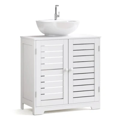 ManoManoAmple Storage for Bathroom Essentials : Discover two spacious compartments behind the louvred doors, perfectly designed to store towels, toiletries, cleaning supplies and all your bathroom necessities. Keep everything organised and within easy reach while maintaining a clutter-free space. Smart Ventilated Design : The stylish louvred doors don't just look contemporary - they promote essential airflow to prevent moisture buildup and protect your stored items from dampness and mould. The clever top cutout seamlessly accommodates plumbing fittings while shielding contents from water splashes and dust. Durable & Moisture-Resistant : Built from sturdy MDF with excellent water-resistant properties, this cabinet maintains its stability and appearance even in humid bathroom environments. The smooth surface wipes clean effortlessly, ensuring long-lasting beauty with minimal maintenance required. Perfect Fit Specifications : Measuring 59x30x60.5 cm with a 20 x 20cm siphon hole, this cabinet