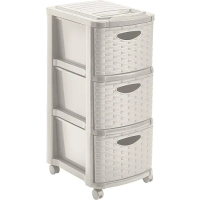 ELEGANT AND NATURAL DESIGN: Wicker weave look for a decorative and modern touch, ideal for any room in the house. CONVENIENT AND SPACIOUS STORAGE: 3 large A4 drawers to organize your documents, clothes, accessories or beauty products. EASY MOBILITY: Equipped with 4 sturdy casters for effortless movement, perfect for flexible use. DURABLE AND EASY TO CARE MATERIAL: High quality plastic, moisture resistant and washable for easy maintenance. COMPACT AND FUNCTIONAL FORMAT: Height of 66 cm, ideal for maximizing space while providing ample storage capacity. MADE IN FRANCE: Product designed with care to ensure quality and durability.