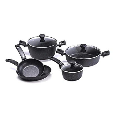 Artech stone Ultra: the stone surface features mineral particles which makes it extremely resistant to abrasion. No PFOA, no nickel, no Biphenyl A Food contact safe aluminium, Ideal heat distribution for evenly-cooked meals Suitable for all heat sources except induction. Dishwasher-safe Made in Italy. 5 years limited warranty 8 pieces Chef Set 20+26cm, Saucepan 16cm, Casserole 24cm,Skillet 28cm, Glass Lid with Stainless steel rim 16+24+28cm