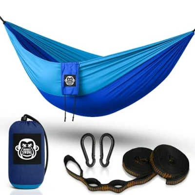 Ultralight & Compact – This camping hammock weighs only about 700g and fits into a compact carry bag. Perfect for backpackers, hikers, and any hammock camping adventure. Extremely Strong & Safe – Made of tear-resistant parachute nylon and reinforced with triple-stitched seams, this hammock supports up to 300 kg and easily fits 2 people (sitting). More durable than standard hammocks. Complete Hanging Kit – Comes with two wide (2.5 cm) tree-friendly straps with 11 loops and strong steel carabiners. Set up your tree hammock securely in seconds – no knots needed. Your Outdoor All-Rounder – Whether for hiking, camping, the beach, or your backyard – this outdoor hammock is the perfect way to relax in nature. A must-have for campers and adventurers. Comfortable & Breathable – Soft, breathable parachute nylon hugs your body and keeps you cool on hot days. Fast-drying and mildew-resistant – ideal for hammock camping in all conditions.