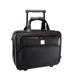 EurofficeSleek, smart nylon laptop case with trim. Integrated trolley mechanism with telescopic handle. Padded carry handles and shoulder strap. Pocket organiser and second pocket divided into two. Lockable zipper for added security.