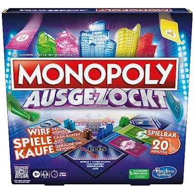 Playable in approx. 20 MINUTES: Forget everything you ever knew about Monopoly Monopoly Auszockt is a fast-paced card board game that can be played in an average of 20 minutes Fast monopoly game: this Monopoly game for adults and children aged 8 and up makes players sweat when they put their luck to the test! Dice. Flip cards and discover cash cards. Buying and Winning Buildings With each card revealed, the excitement and risk increases: each player rolls the dice and reveals a corresponding number of cards from their pile. If you are lucky, you will uncover cash cards - but with each additional card the risk of going bankrupt increases FIGHT FOR PLOT OWNERSHIP: Players must take strategic action when placing their cards on the game plan to claim properties as their own BUILT THE LONGEST SKYLINE TO WIN: Once a player owns a property, they can add a building to their skyline. Whoever is the first player to reach the target marking of his skyline wins, Manufacturer: Hasbro