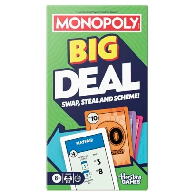 OVERSIZED MONOPOLY DEAL CARDS: make a fortune fast, in a BIG way! In this Monopoly Big Deal game, enjoy the same quick fun of classic Monopoly Deal gameplay with hilariously huge cards CARDS 4 TIMES LARGER THAN IN ORIGINAL GAME: these jumbo cards are four times the size of the original Monopoly Deal cards, adding a big surprise to game nights and parties FAST FUN, BIG LAUGHS: playing with giant cards is just funny. And since each game can be played in as little as 15 minutes, it’s easy to fit in laughter at any time – after school, before dinner and Family Game Night SAME MONOPOLY DEAL GAMEPLAY FANS LOVE: swap, steal and scheme! Collect three property sets to win. Use Action cards to collect rent, steal and swap properties, or get paid by opponents when ‘It’s your birthday!’ EASY TO READ AND HOLD: the large playing cards are easy to read, handle and shuffle. This light strategy card game is quick to learn too. Each player gets a reference card to remind them what to do on their turn, Manufacturer: Hasbro