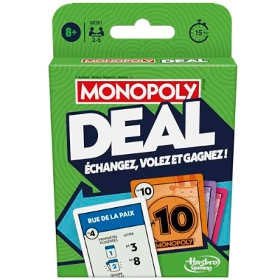 QUICK MONOPOLY CARD GAME: We trade and fly to win the Monopoly Deal card game, a favorite of families! The Monopoly game is found in a fast card game for kids and adults. ONE PART CAN LAST 15 MINUTES: Buy, sell, trade and earn even faster! A game of Monopoly Deal card game can last just 15 minutes, perfect for family play at any time of the day COLLECT 3 PROPERTY GROUPS TO WIN: In this captivating strategic card game, the first player to collect 3 groups of different color properties wins ACTION CARDS CHANGE PART: Action cards can be used to collect rent, steal and trade, or receive money from other players when "it's your birthday" EASY TO LEARN: The Monopoly Deal card game can be learned, taught and played in an instant. It even contains handy reference cards to remind players what to do in turn, as well as tips and rules of the game, Manufacturer: Hasbro